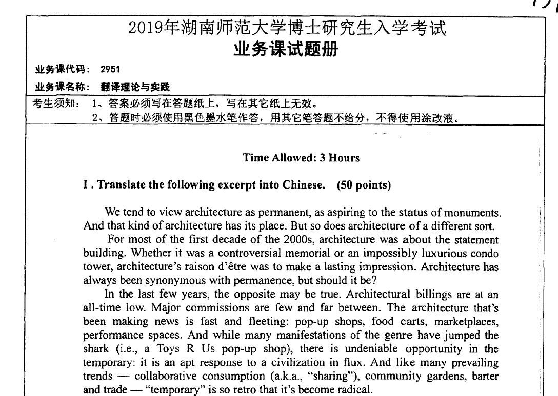 湖南师范大学 2951 翻译理论与实践考博真题覆盖 2012-2025 年关键年份,所有年份真题均配备完整、精准的高分答案详解,解析由翻译专业教研团队编写,涵盖考点定位、翻译技巧分析、理论逻辑推导及学术观点梳理,能帮助考生高效掌握命题规律与应试策略。以下为 2019 年湖南师范大学 2951 翻译理论与实践考博真题(精选 6 道典型题目)及答案详解,助力考生针对性备考。