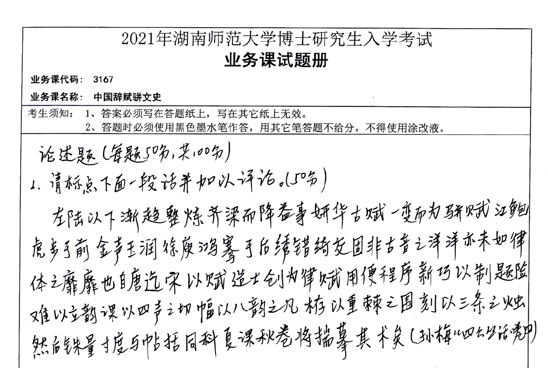 中国辞赋骈文史是湖南师范大学中国语言文学类博士研究生招生考试的核心专业科目,其真题对把握中国辞赋骈文发展脉络、提升文学理论分析与文本解读能力具有关键指导意义。考生可通过以下权威渠道获取该校全学科考博真题(含英语、中国辞赋骈文史、专业课等)及配套高分答案详解,为备考提供精准资源支撑:
