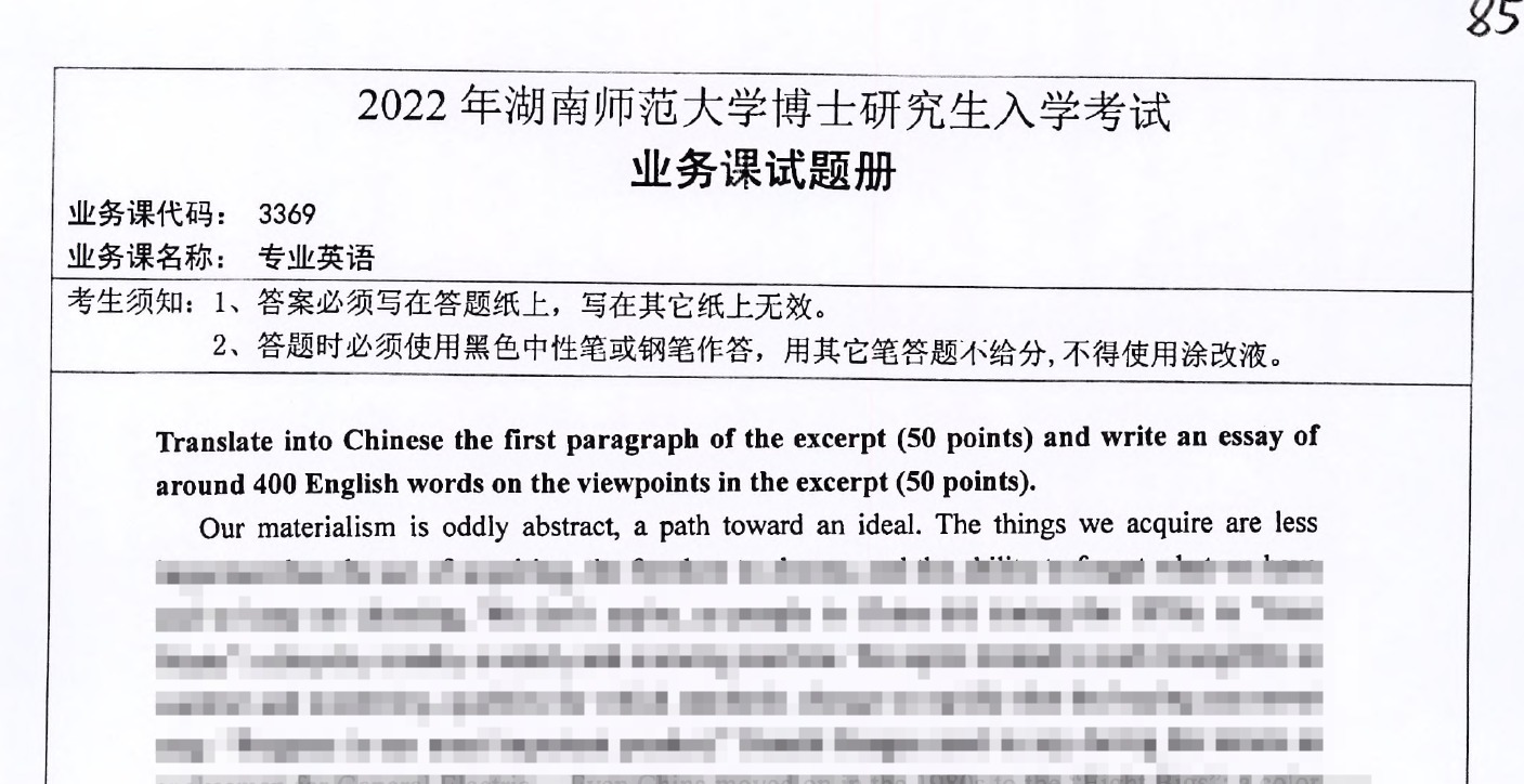 湖南师范大学 3369 专业英语考博真题覆盖 2012-2025 年关键年份,所有年份真题均配备完整、精准的高分答案详解,解析由英语专业教研团队编写,涵盖考点定位、翻译技巧、写作逻辑及学术观点梳理,能帮助考生高效掌握命题规律与应试策略。以下为湖南师范大学 3369 专业英语考博真题(精选题目)及答案详解,助力考生针对性备考。