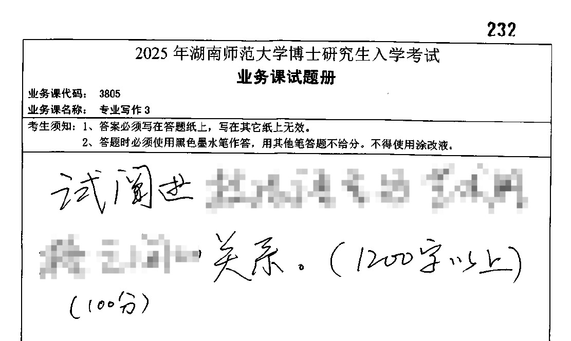 专业写作 3 是湖南师范大学多学科博士研究生招生考试的核心科目,其真题对提升学术写作深度、把握专业领域内关键关系的阐释能力具有关键指导意义。考生可通过以下权威渠道获取该校全学科考博真题(含英语、专业写作 3、专业课等)及配套高分答案详解,为备考提供精准资源支撑: