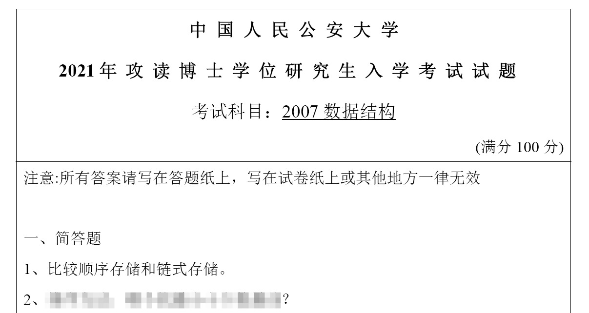 数据结构是中国人民公安大学计算机科学与技术类博士研究生招生考试的核心专业科目,其真题对把握数据结构命题方向、提升算法理论分析与应用能力具有关键指导意义。考生可通过以下权威渠道获取该校全学科考博真题(含数据结构、各专业课等)及配套高分答案详解,为备考提供精准资源支撑: