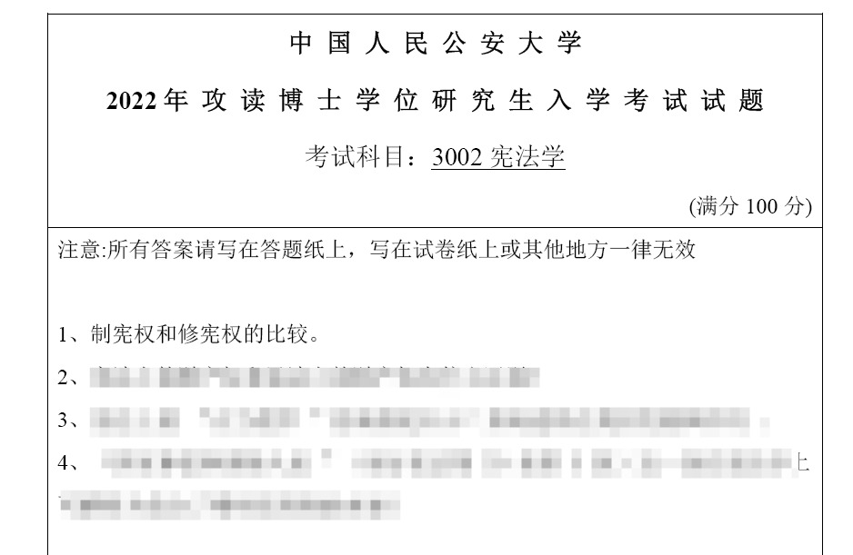 中国人民公安大学 3002 宪法学考博真题覆盖多年份,所有年份真题均配备完整、精准的高分答案详解,解析由法学专业教研团队编写,涵盖考点定位、宪法现象分析、理论逻辑推导及学术观点梳理,能帮助考生高效掌握命题规律与应试策略。以下为中国人民公安大学 3002 宪法学考博真题(精选题目)及答案详解,助力考生针对性备考。