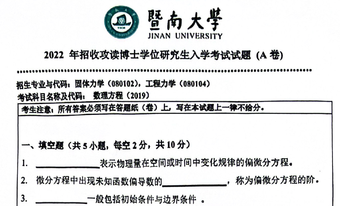 数理方程是暨南大学固体力学、工程力学类博士研究生招生考试的核心专业科目,其真题对把握数理方程命题方向、提升数学物理方程理论分析与应用能力具有关键指导意义。考生可通过以下权威渠道获取该校全学科考博真题(含数理方程、各专业课等)及配套高分答案详解,为备考提供精准资源支撑: