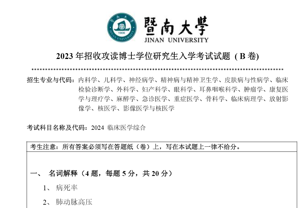 考博备考需依托权威真题资源,暨南大学 2024 临床医学综合考博真题及全学科考博资料(含各专业课)均配备高分答案详解,可通过以下渠道获取: