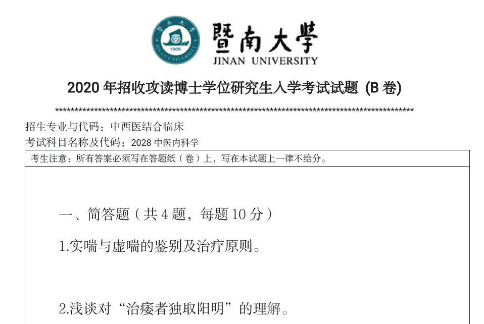 中医内科学是暨南大学中西医结合临床专业博士研究生招生考试的核心专业科目,其真题对把握中医内科学命题方向、提升中医理论分析与临床应用能力具有关键指导意义。考生可通过以下权威渠道获取该校全学科考博真题(含中医内科学、各专业课等)及配套高分答案详解,为备考提供精准资源支撑: