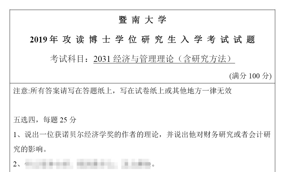 经济与管理理论(含研究方法)是暨南大学经济管理类博士研究生招生考试的核心专业科目,其真题对把握经济与管理学科命题方向、提升理论分析与研究方法应用能力具有关键指导意义。考生可通过以下权威渠道获取该校全学科考博真题(含经济与管理理论、各专业课等)及配套高分答案详解,为备考提供精准资源支撑: