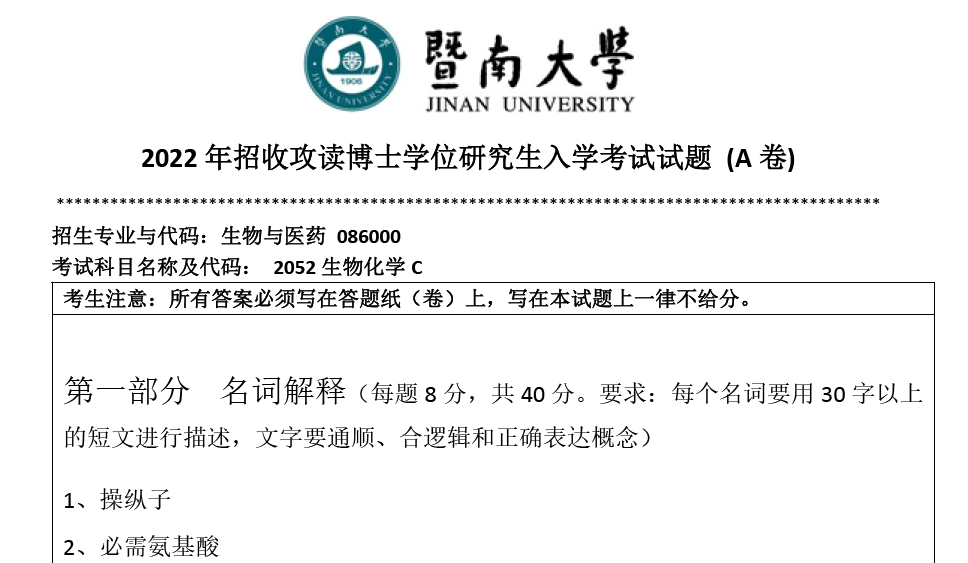 生物化学 C 是暨南大学生物与医药专业博士研究生招生考试的核心专业科目,其真题对把握生物化学命题方向、提升生物化学理论分析与应用能力具有关键指导意义。考生可通过以下权威渠道获取该校全学科考博真题(含生物化学 C、各专业课等)及配套高分答案详解,为备考提供精准资源支撑: