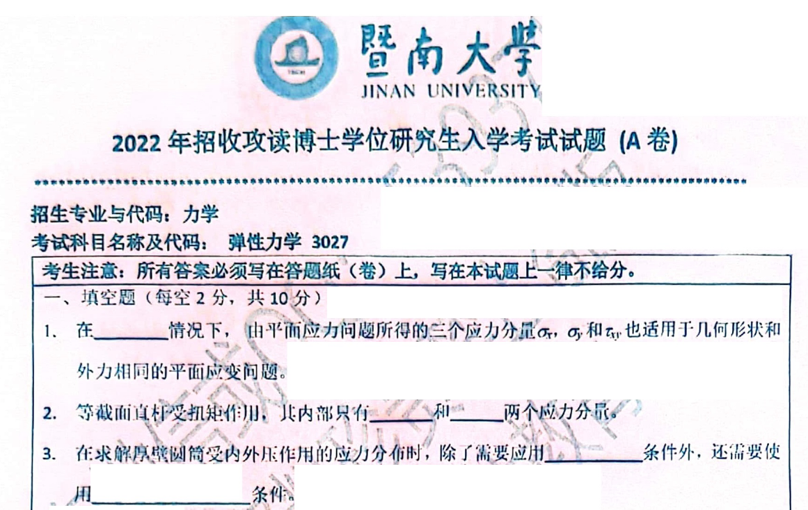 弹性力学是暨南大学力学专业博士研究生招生考试的核心专业科目,其真题对把握弹性力学命题方向、提升弹性力学理论分析与应用能力具有关键指导意义。考生可通过以下权威渠道获取该校全学科考博真题(含弹性力学、各专业课等)及配套高分答案详解,为备考提供精准资源支撑: