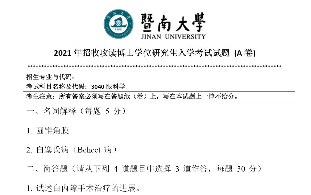 眼科学是暨南大学临床医学类博士研究生招生考试的核心专业科目,其真题对把握眼科学命题方向、提升眼科疾病理论分析与临床应用能力具有关键指导意义。考生可通过以下权威渠道获取该校全学科考博真题(含眼科学、各专业课等)及配套高分答案详解,为备考提供精准资源支撑: