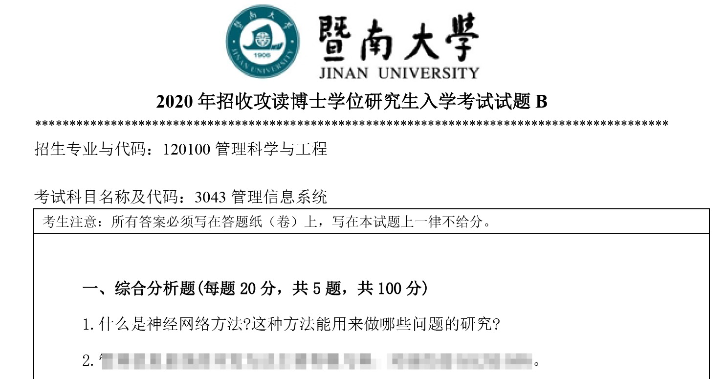 管理信息系统是暨南大学管理科学与工程专业博士研究生招生考试的核心专业科目,其真题对把握管理信息系统命题方向、提升信息系统理论分析与应用能力具有关键指导意义。考生可通过以下权威渠道获取该校全学科考博真题(含管理信息系统、各专业课等)及配套高分答案详解,为备考提供精准资源支撑: