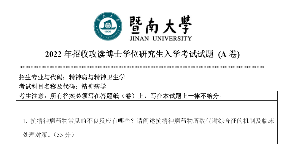 精神病学是暨南大学精神病与精神卫生学专业博士研究生招生考试的核心专业科目,其真题对把握精神病学命题方向、提升精神疾病诊疗理论分析与临床应用能力具有关键指导意义。考生可通过以下权威渠道获取该校全学科考博真题(含精神病学、各专业课等)及配套高分答案详解,为备考提供精准资源支撑: