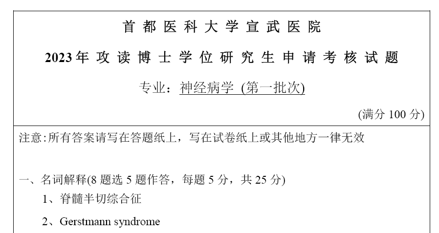 首都医科大学神经病学(宣武医院)考博真题覆盖多年份,所有年份真题均配备完整、精准的高分答案详解,解析由神经病学专业教研团队编写,涵盖考点定位、神经系统疾病现象分析、诊疗逻辑推导及学术观点梳理,能帮助考生高效掌握命题规律与应试策略。以下为首都医科大学神经病学(宣武医院)考博真题(精选题目)及答案详解,助力考生针对性备考。