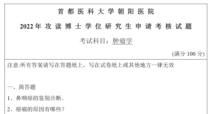 建议考生结合真题及答案详解系统备考,重点掌握 “肿瘤学临床问题解读”“肿瘤疾病现象辩证分析”“学术前沿追踪” 三大能力,同时关注肿瘤学前沿研究(如头颈部肿瘤的分子分型研究、癌痛的精准镇痛机制研究等),提升学术表达与问题解决能力,预祝各位考生考博成功!