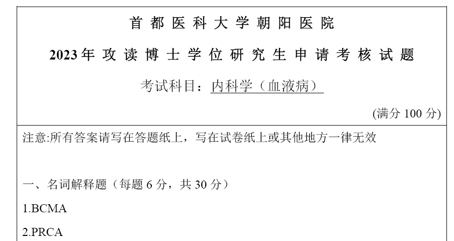 建议考生结合真题及答案详解系统备考,重点掌握 “血液病学经典概念解读”“血液疾病现象辩证分析”“学术前沿追踪” 三大能力,同时关注血液病学前沿研究(如 BCMA 双靶点 CAR-T 的研发、PRCA 的免疫微环境调控研究等),提升学术表达与问题解决能力,预祝各位考生考博成功!
