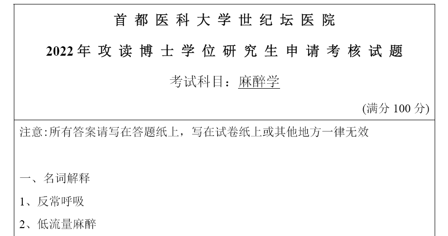 首都医科大学麻醉学(世纪坛医院)考博真题覆盖多年份,所有年份真题均配备完整、精准的高分答案详解,解析由麻醉学专业教研团队编写,涵盖考点定位、麻醉技术现象分析、管理逻辑推导及学术观点梳理,能帮助考生高效掌握命题规律与应试策略。以下为首都医科大学麻醉学(世纪坛医院)考博真题(精选题目)及答案详解,助力考生针对性备考。