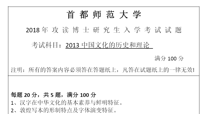 中国文化的历史和理论是首都师范大学人文学科类博士研究生招生考试的核心专业科目,其真题对把握中国文化命题方向、提升文化理论分析与应用能力具有关键指导意义。考生可通过以下权威渠道获取该校全学科考博真题(含 2013 中国文化的历史和理论、各专业课等)及配套高分答案详解,为备考提供精准资源支撑: