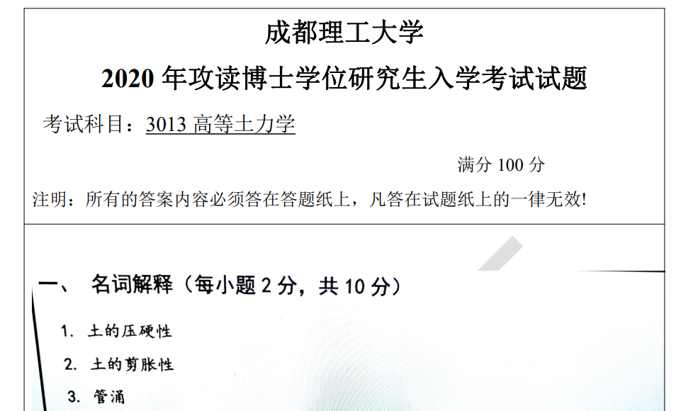 高等土力学是成都理工大学地质工程、土木工程等专业博士研究生招生考试的核心专业科目,其真题聚焦土的力学特性与工程问题,对考生的岩土工程学术素养具有关键考查意义。考生可通过以下权威渠道获取该校全学科考博真题(含高等土力学、各专业课等)及配套高分答案详解,为备考提供精准资源支撑: