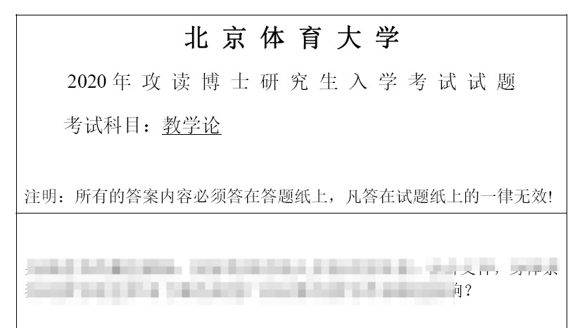 北京体育大学教学论考博真题覆盖多年份,所有年份真题均配备完整、精准的高分答案详解,解析由体育教学专业教研团队编写,涵盖教学理论、体育教学实践等内容,能帮助考生高效掌握命题规律与应试策略。以下为北京体育大学教学论考博真题(精选题目)及答案详解,助力考生针对性备考。