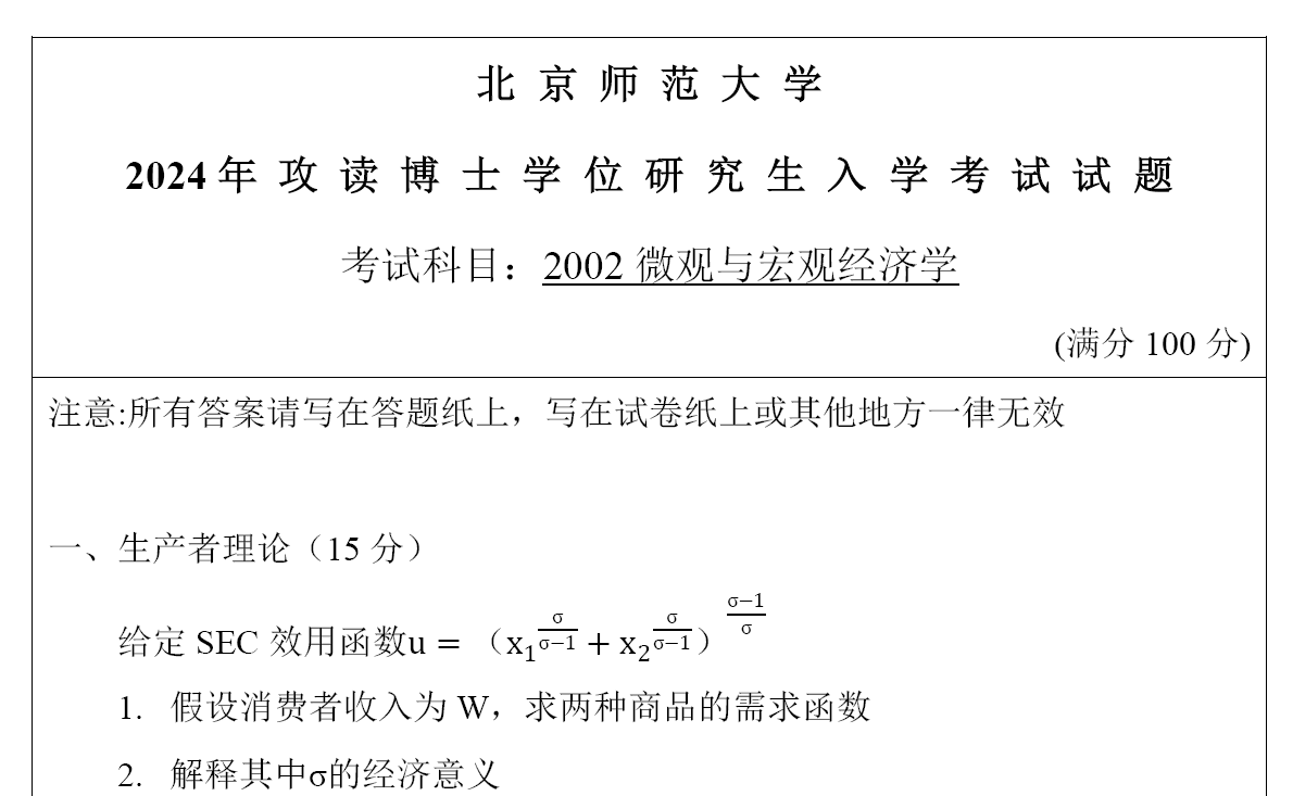 北京师范大学微观与宏观经济学考博真题覆盖多年份,所有年份真题均配备完整、精准的高分答案详解,解析由经济学专业教研团队编写,涵盖理论模型、函数推导等内容,能帮助考生高效掌握命题规律与应试策略。以下为北京师范大学微观与宏观经济学考博真题(精选题目)及答案详解,助力考生针对性备考。