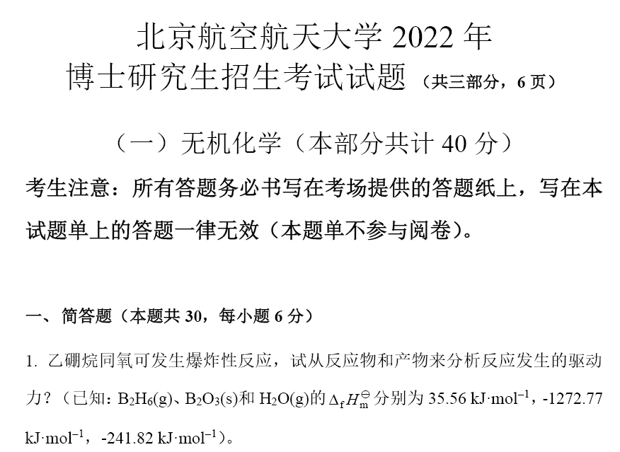 综合能力考核 (含无机化学) 是北京航空航天大学化学学院博士研究生招生考试的核心科目,其真题聚焦无机化学核心反应与热力学分析,对考生的化学学科素养具有关键考查意义。考生可通过以下权威渠道获取该校全学科考博真题(含综合能力考核 (含无机化学)、各专业课等)及配套高分答案详解,为备考提供精准资源支撑: