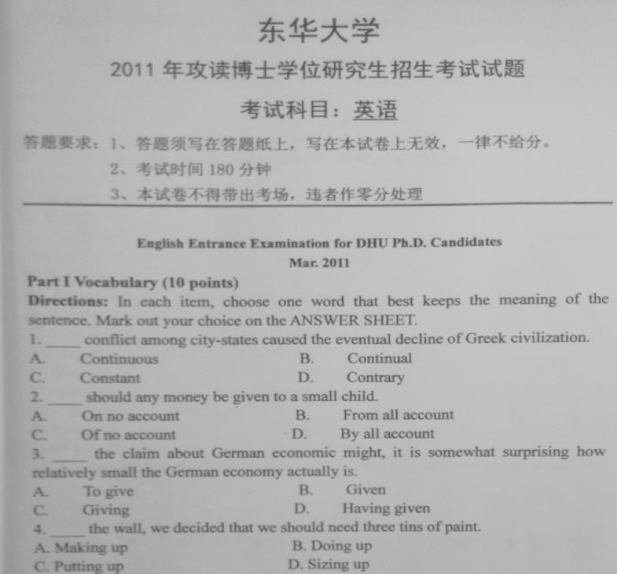 东华大学英语考博真题覆盖多年份,所有年份真题均配备完整、精准的高分答案详解,解析由英语专业教研团队编写,涵盖词汇辨析、固定搭配等内容,能帮助考生高效掌握命题规律与应试策略。以下为东华大学英语考博真题(精选题目)及答案详解,助力考生针对性备考。