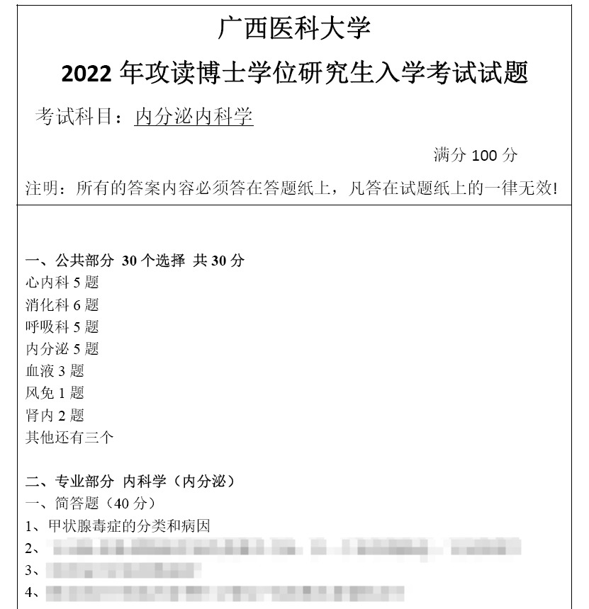 内分泌内科学是广西医科大学临床医学(内分泌专业)等相关学科博士研究生招生考试的核心科目,其真题聚焦内分泌系统疾病的分类、病因等核心临床知识,对考生的内分泌专科素养与临床理论储备具有关键考查意义。考生可通过以下权威渠道获取该校全学科考博真题(含内分泌内科学、各专业课等)及配套高分答案详解,为备考提供精准资源支撑: