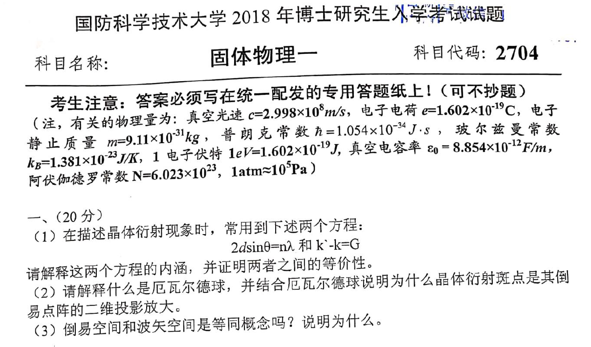 固体物理是国防科技大学物理学、材料科学与工程等专业博士研究生招生考试的核心科目,其真题聚焦晶体衍射、倒易空间等固体物理核心理论,对考生的固体物理基础储备与理论推导能力具有关键考查意义。考生可通过以下权威渠道获取该校全学科考博真题(含固体物理、各专业课等)及配套高分答案详解,为备考提供精准资源支撑: