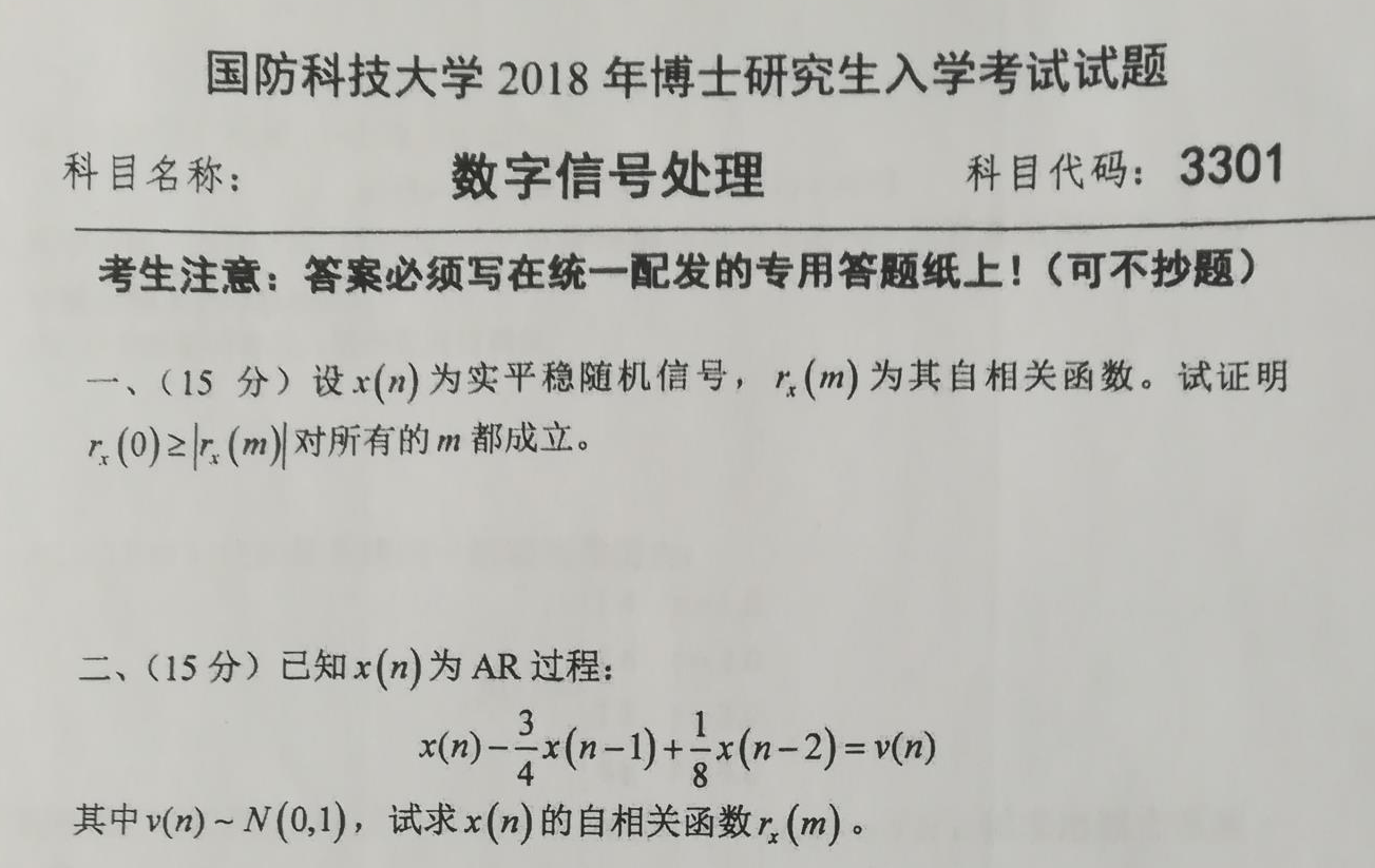 国防科技大学数字信号处理考博真题覆盖多年份,所有年份真题均配备完整、精准的高分答案详解,解析由信号处理专业教研团队编写,涵盖随机信号自相关性质、AR 过程自相关求解等核心内容,能帮助考生高效掌握命题规律与应试策略。以下为国防科技大学数字信号处理考博真题(精选题目)及答案详解,助力考生针对性备考。