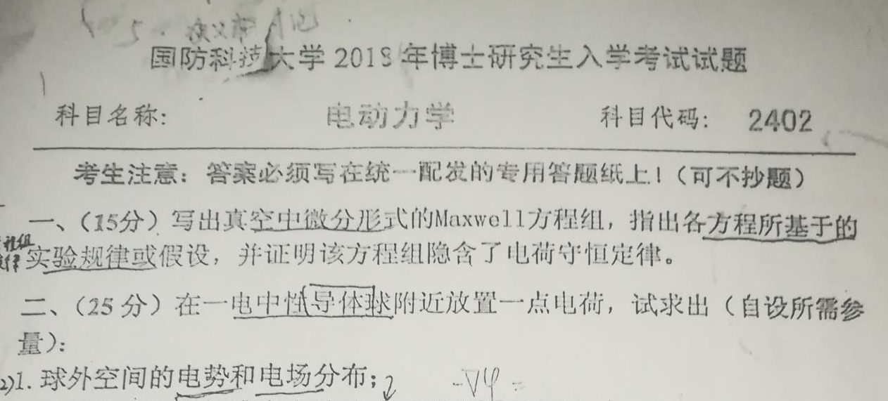 电动力学是国防科技大学物理学、电子科学与技术等专业博士研究生招生考试的核心科目,其真题聚焦 Maxwell 方程组、静电场边值问题等核心内容,对考生的电动力学理论储备与推导能力具有关键考查意义。考生可通过以下权威渠道获取该校全学科考博真题(含电动力学、各专业课等)及配套高分答案详解,为备考提供精准资源支撑: