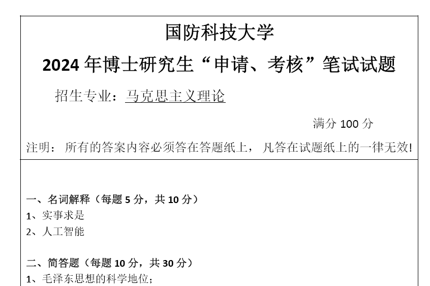 国防科技大学 2024 年博士研究生 “申请、考核” 笔试试题