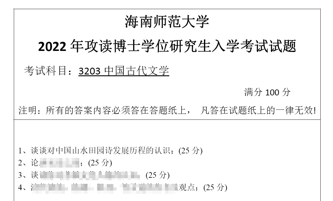 海南师范大学中国古代文学考博真题覆盖多年份,所有真题均配备精准解析,能帮助考生高效掌握命题规律。以下为 2022 年该科目考博真题(精选)及答案详解: