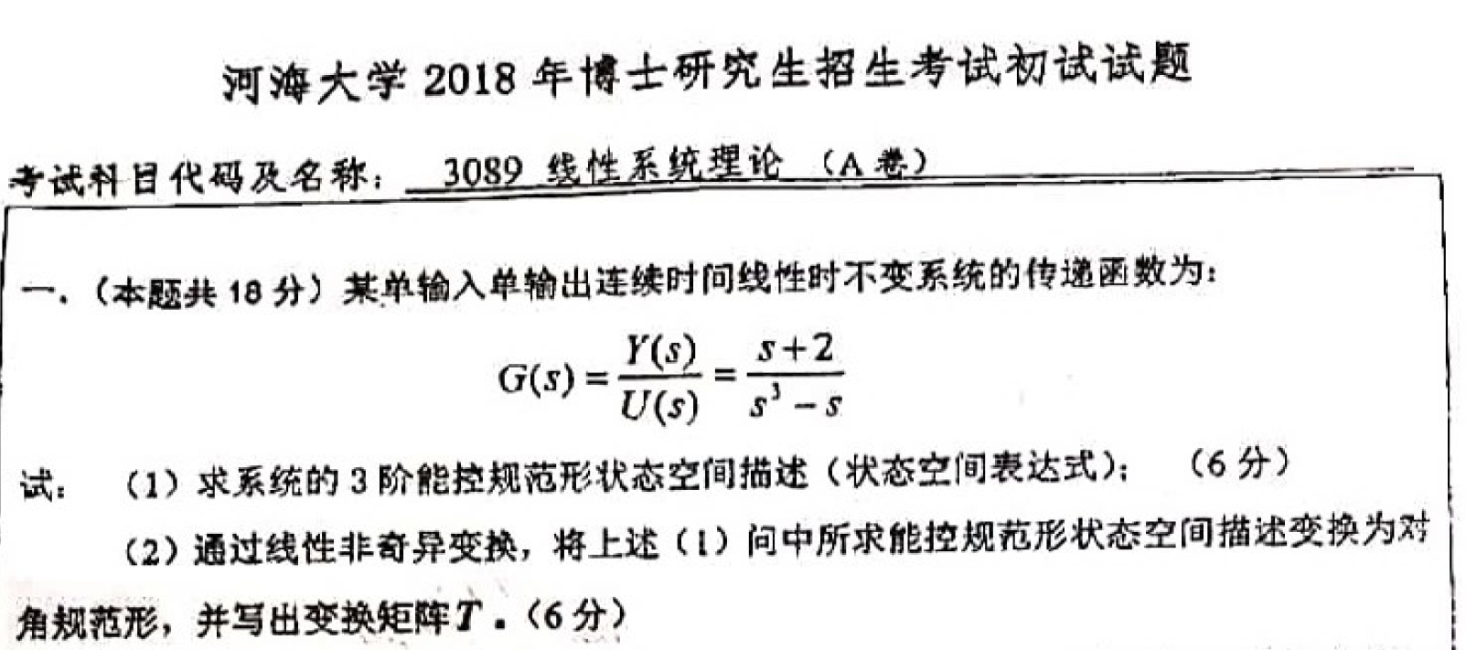 河海大学考博真题,线性系统理论考博试题