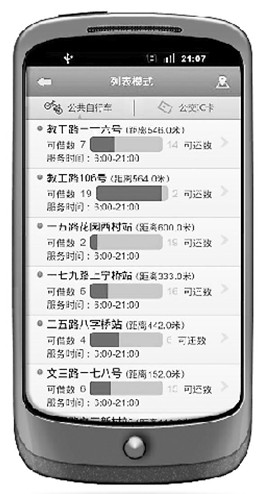 今年6月毕业设计结束后,潘煜昕和他的两位同学一起开发这款软件。它可以定位周边600米范围内的公共自行车租赁点,包括多少单车可以借,多少单车能还进,编号、地址、服务时间等一应俱全。软件还有一个功能是定位周边公交IC卡充值发售点。