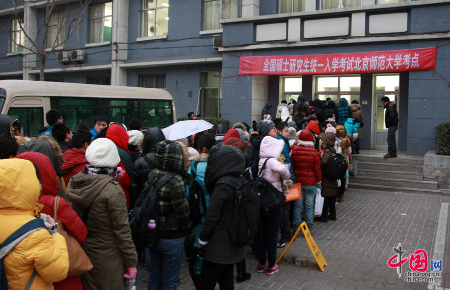 7日,2012年全国硕士研究生入学考试开考,北师大考场门前考生等待进入考场。