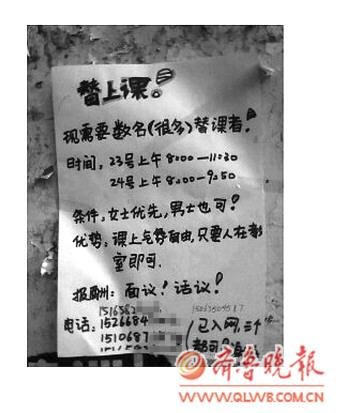 “找人替课都敢贴广告,太大胆了。”大一学生小吴说,平时有同学逃课都是偷偷摸摸的,没想到有人敢公开招人。